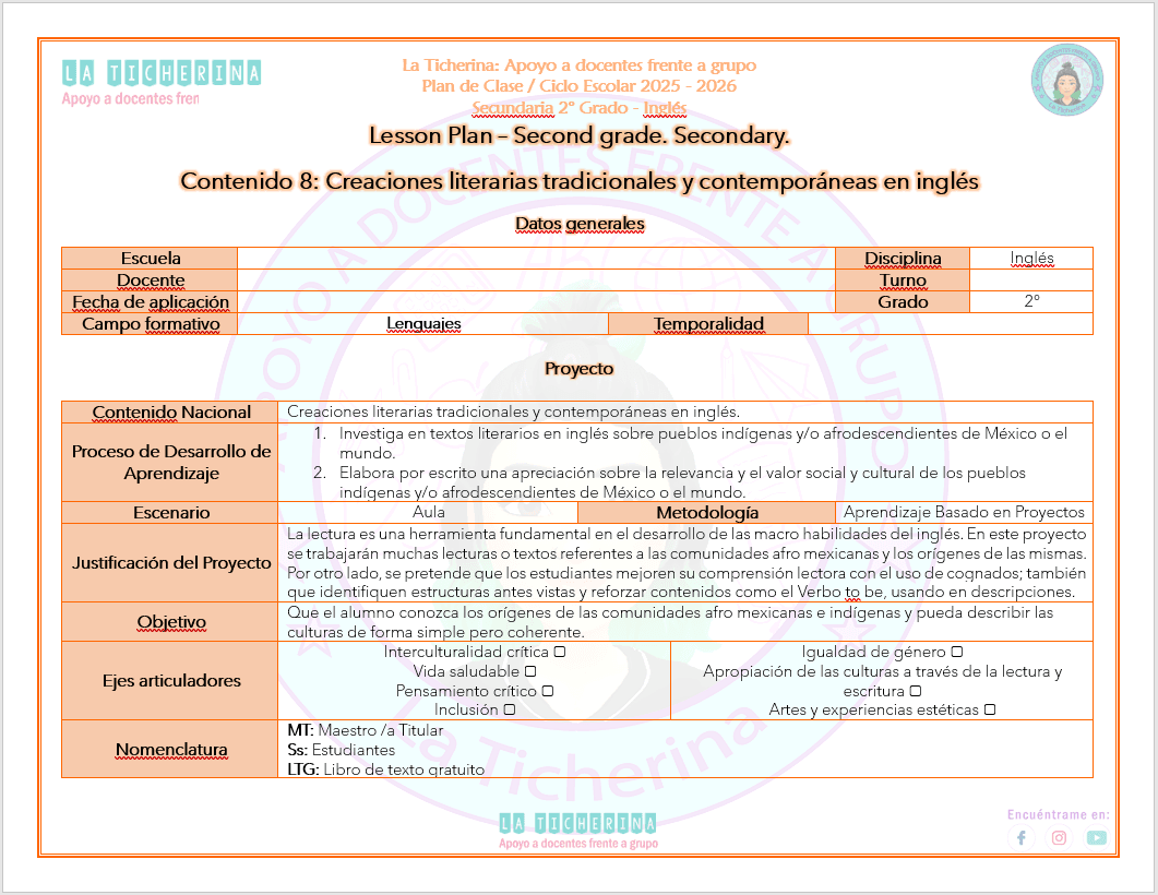 Planeación Inglés Contenido 8 / Creaciones literarias tradicionales y contemporáneas en inglés / 2° de Secundaria Ciclo 2025 – 2026