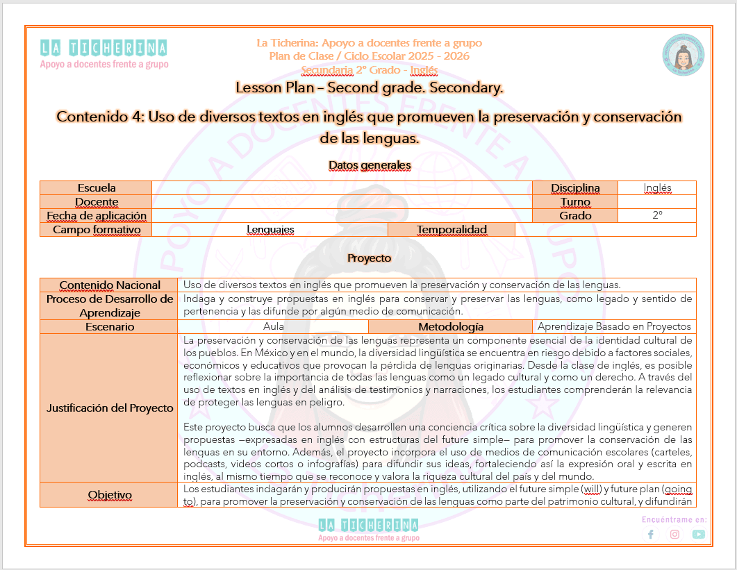 Planeación Inglés Contenido 4 / Uso de diversos textos en inglés que promueven… / 1° de Secundaria Ciclo 2025 – 2026