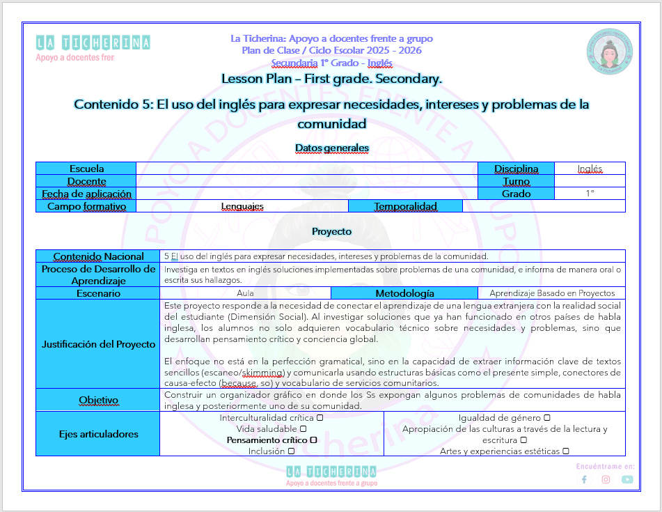 Planeación Inglés Contenido 5 / El uso del inglés para expresar necesidades… / 1° de Secundaria Ciclo 2025 – 2026